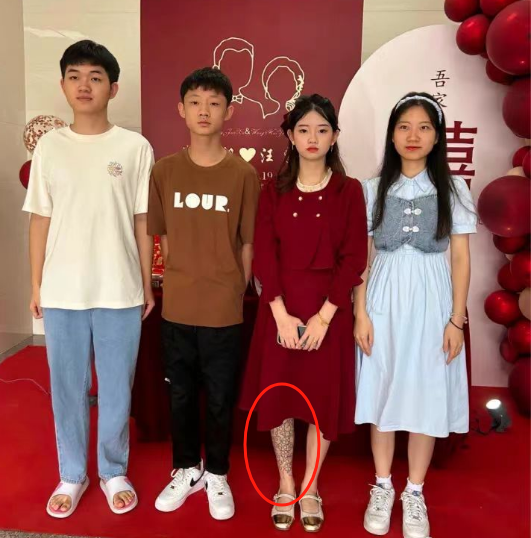 然而,令人遗憾的是,新娘的腿部纹身在红色半身裙的映衬下格外显眼,网友们对此提出了不少疑问。
