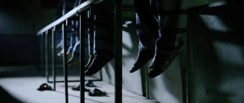 他完成了对六七个死刑犯的处决,这儿只能看到昏暗的空间中,六七具身体突然在空中小幅下坠、猛烈抖动;