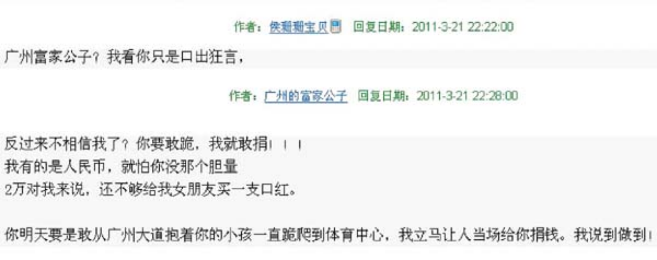 而一个名为“广州市富家公子”的账号回复她,说只要她在广州大道跪行1000米,他就转给她两万救命钱。