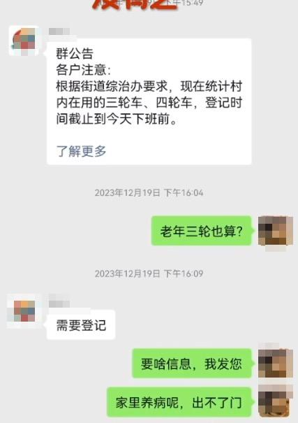 2023年12月19日,群里发布了一份群公告,称接街道办要求,要统计村内在使用的三轮车、四轮车,需要村民们在当天下班前到村委会登记。