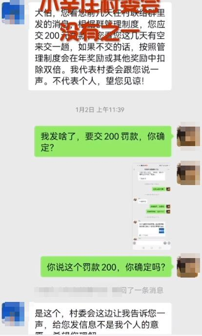 对方告知他,因为他在联络群里发了消息,根据群管理制度,需要给村委会缴纳200元罚款,如果不交的话,会在年奖励或者其他奖励中扣除双倍。
