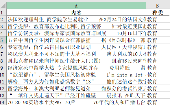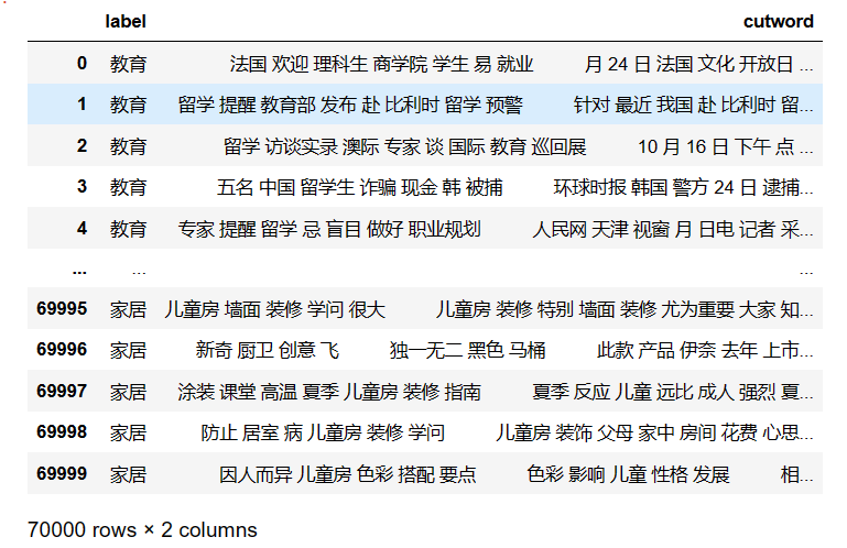 本次这里正好有一组质量特别高的新闻数据,涉及 ‘教育’ ‘科技’ ‘社会’ ‘时政’ ‘财经’ ‘房产’ ‘家居’