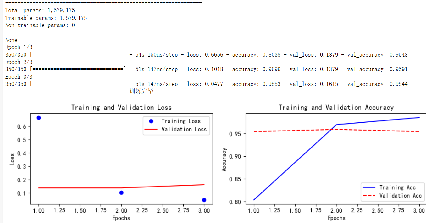 最后这张图是Transformer的,可以看到参数大概157.9w个参数。我只训练了三轮,因为他很容易过拟合。