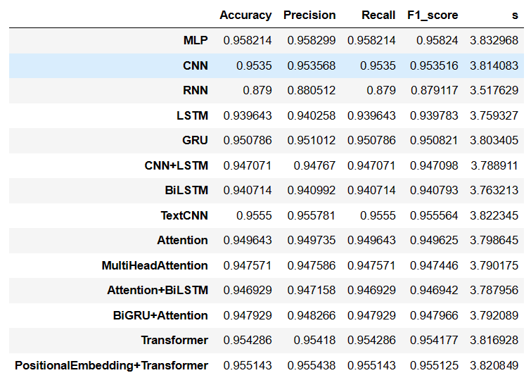 train_fuc(mode='RNN',batch_size=batch_size,epochs=8) train_fuc(mode='LSTM',epochs=epochs) train_fuc(mode='GRU',epochs=epochs) train_fuc(mode='CNN+LSTM',epochs=epochs) train_fuc(mode='BiLSTM',epochs=epochs) train_fuc(mode='TextCNN',epochs=3) train_fuc(mode='Attention',epochs=4) train_fuc(mode='MultiHeadAttention',epochs=3) train_fuc(mode='Attention+BiLSTM',epochs=8) train_fuc(mode='BiGRU+Attention',epochs=4) train_fuc(mode='Transformer',epochs=3) train_fuc(mode='PositionalEmbedding+Transformer',batch_size=batch_size,epochs=3)