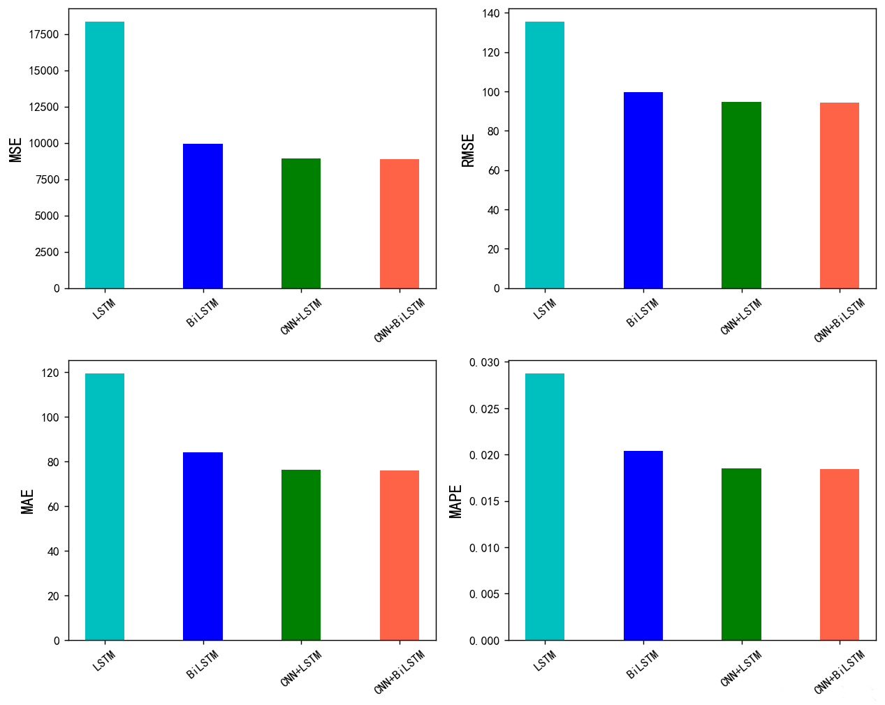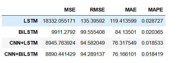 平均绝对百分比误差 (MAPE):MAPE 衡量了模型预测值与真实值之间的平均相对误差。根据结果,CNN+BiLSTM 的 MAPE 值最小,说明该模型在相对预测误差方面表现较好。