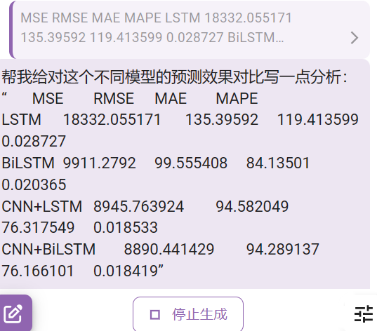 可以看到,根据给出的结果,我们可以进行以下分析来比较不同模型的预测效果:
