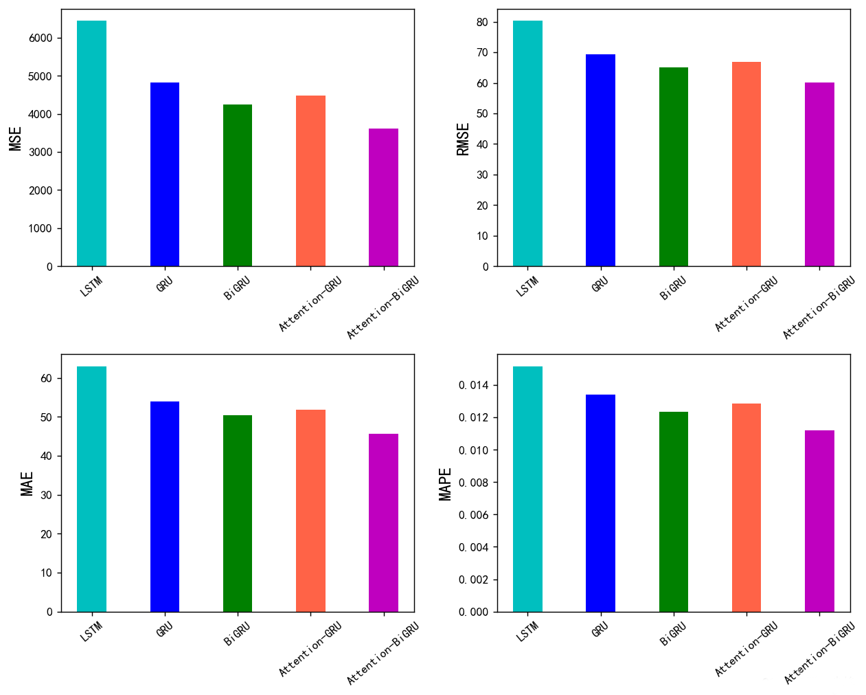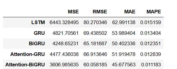 综合上述指标,Attention-BiGRU 模型在这个预测任务中的效果是最好的。它在不同的误差度量指标上都表现出色,预测结果与真实值之间的差异相对较小。