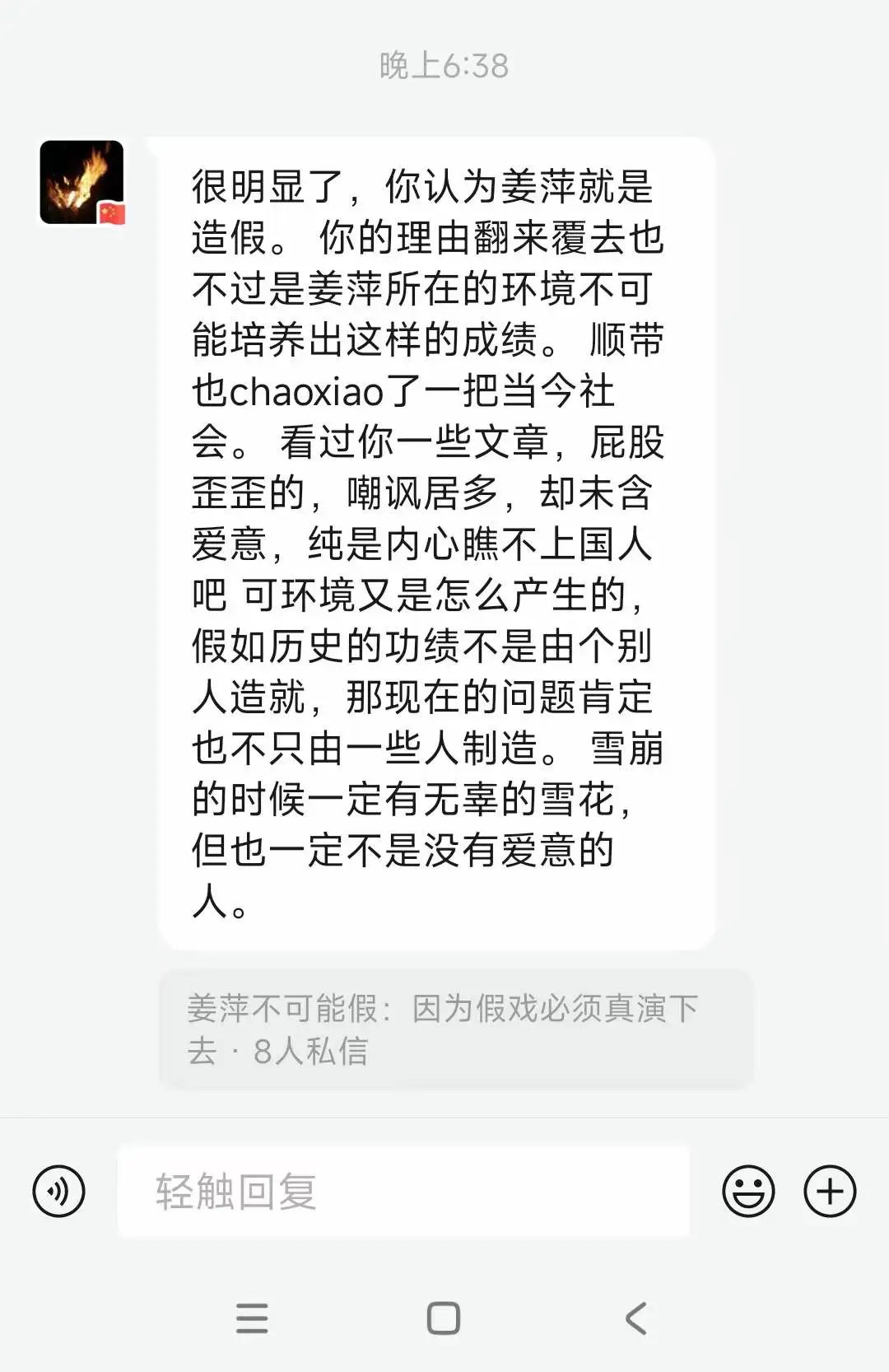 我每天都收到各种恫吓、威胁。他们恨着自己并不熟悉的人。将“私域”的事情,强行拉扯到他们并不熟悉的“公域”,国内、国际政治上面去。这些人是没有任何规则意识的。因此,在遇到姜萍这样的事件时,更是满脑子浆糊。他们不找到一个惩治对象,就格外难受。