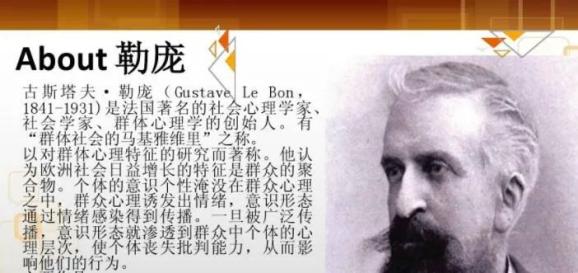 勒庞认为,融入群体中的个人会“智商降低”,失去理性和判断力,变得情绪化和易受暗示。