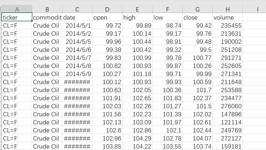 一个csv文件,这个样子,很典型的交易数据,第一行原油代码,第二列名称,开盘价最高价最低价收盘价。