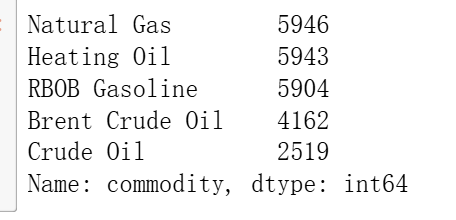 和上面的数量是一样的,但是有个问题,我们后面要分析的话,时间上要是一致的,不能一个类别多一个类别少,就统一一下,用数量最少得crude oil的时间范围取到全部品种上。